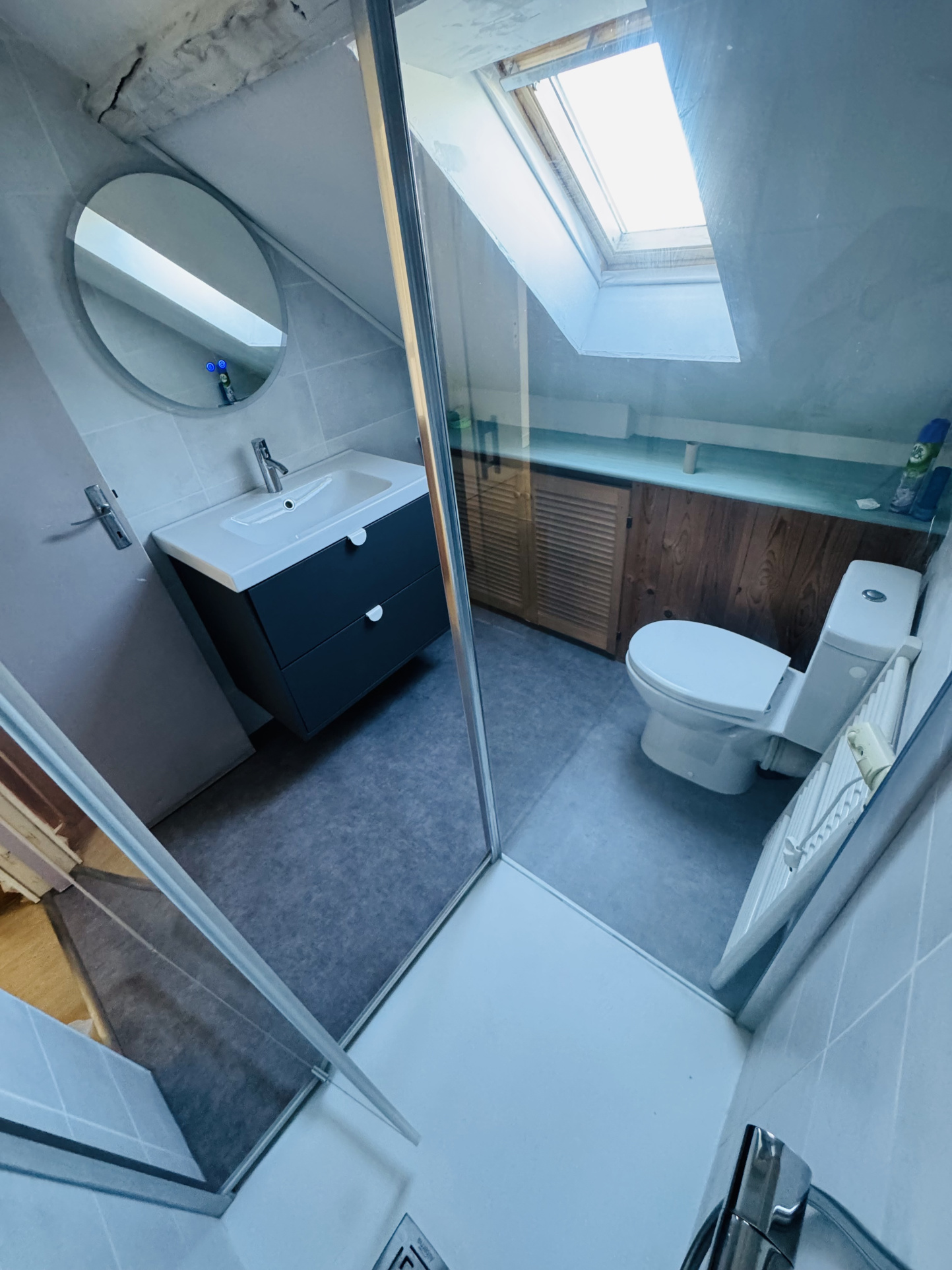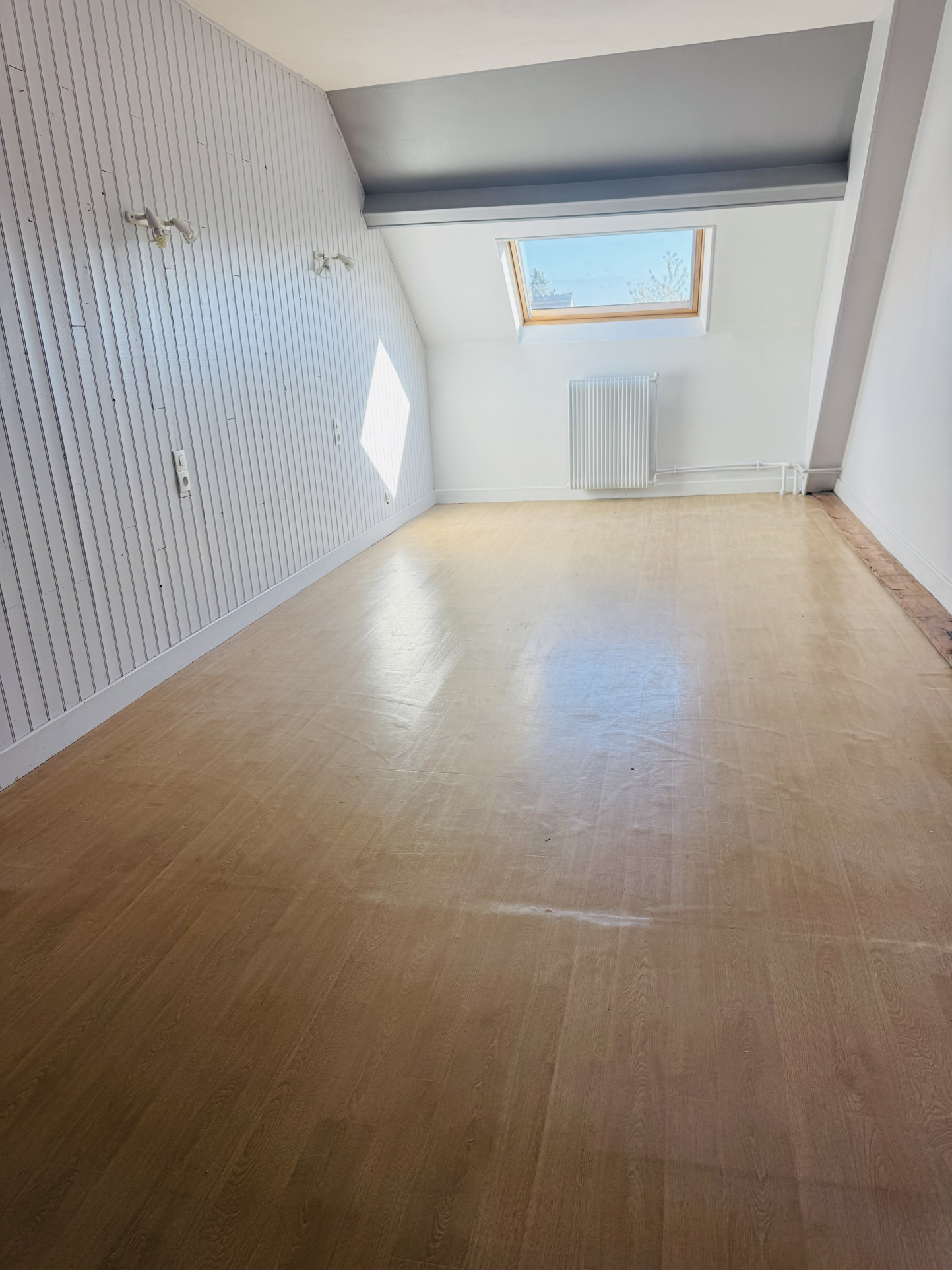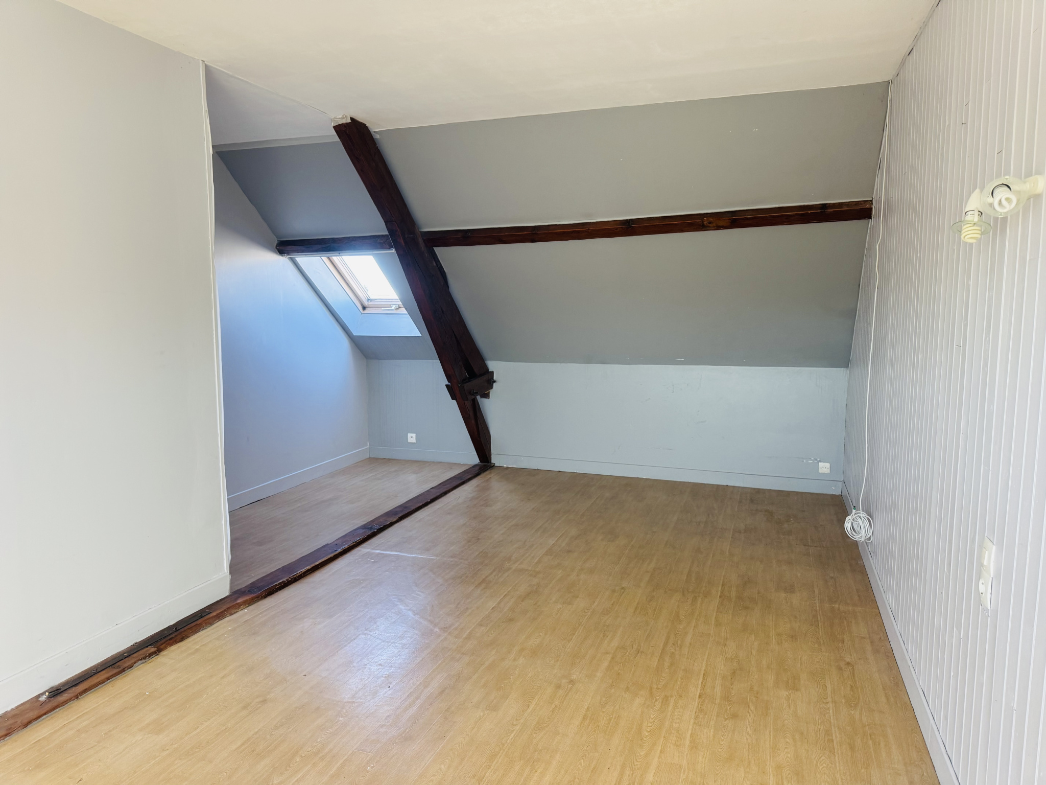 A l'étage : 2 chambres dont très grande (22 m2), salle d'eau avec WC.