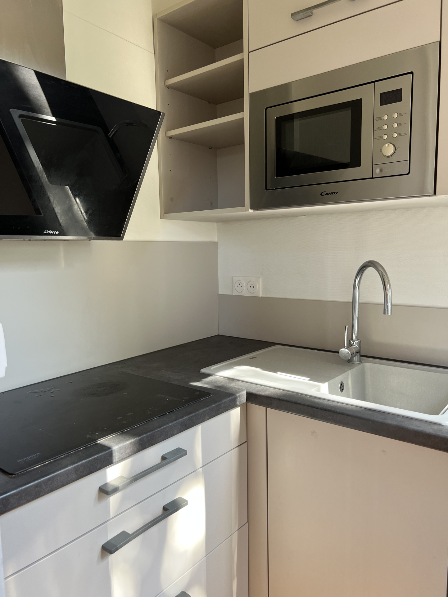 Cet appartement dispose d'un séjour, d'une cuisine, d'une chambre, d'un dressing et d'une salle de bains.