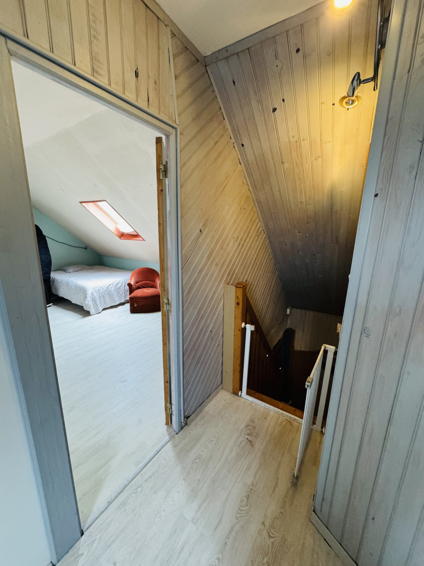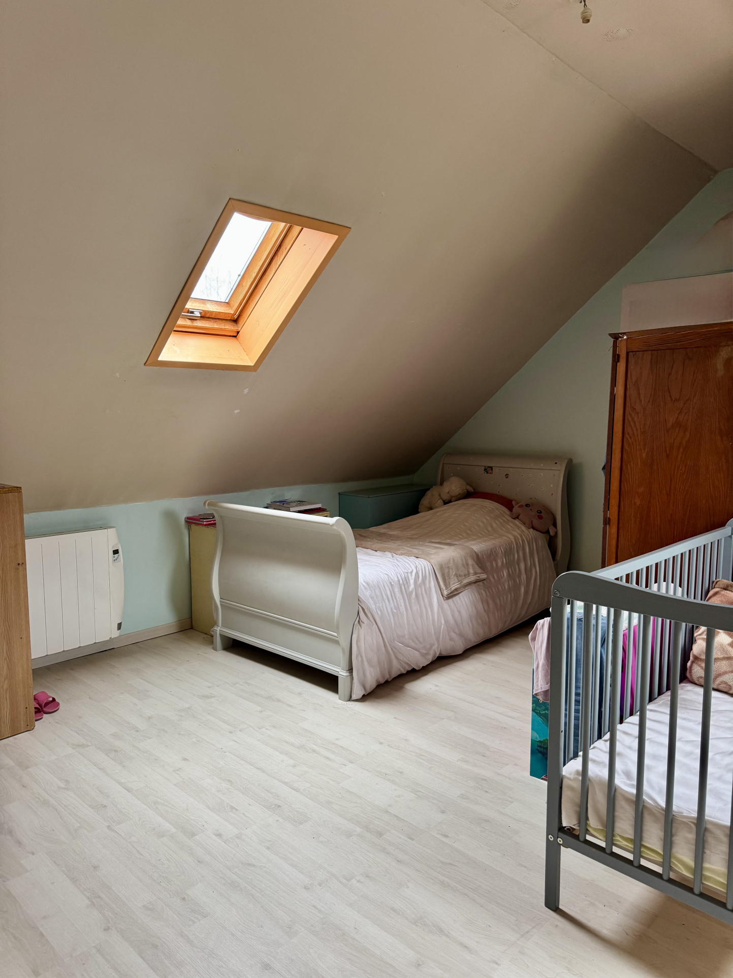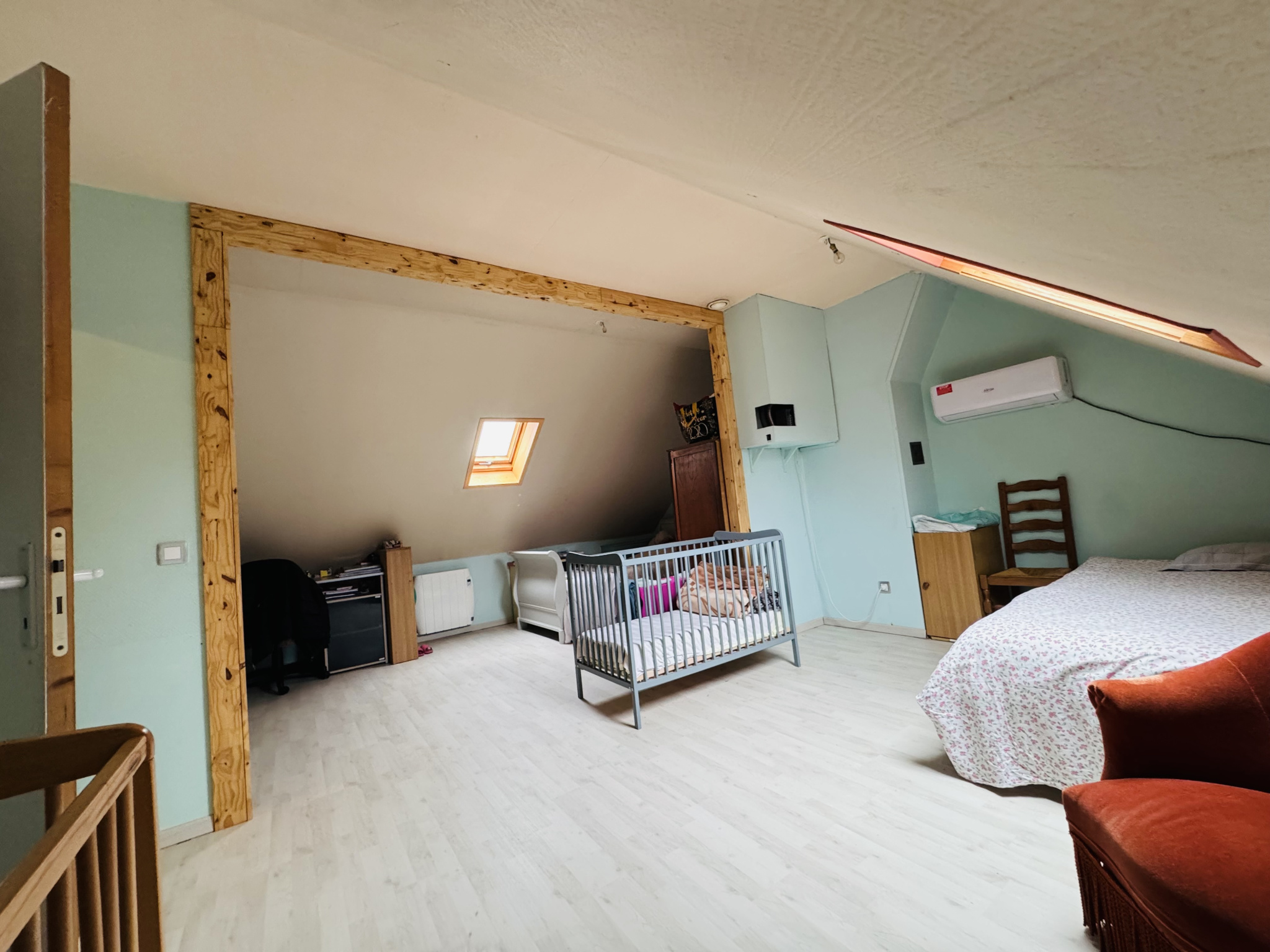 À l’étage, un grand palier pouvant faire office de bureau dessert deux chambres supplémentaires, dont une spacieuse de 28 m2 pouvant être divisée selon vos besoins. Un WC complète cet étage, avec possibilité d’y aménager une douche.