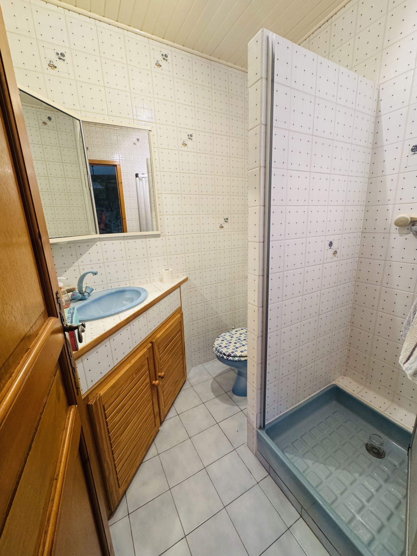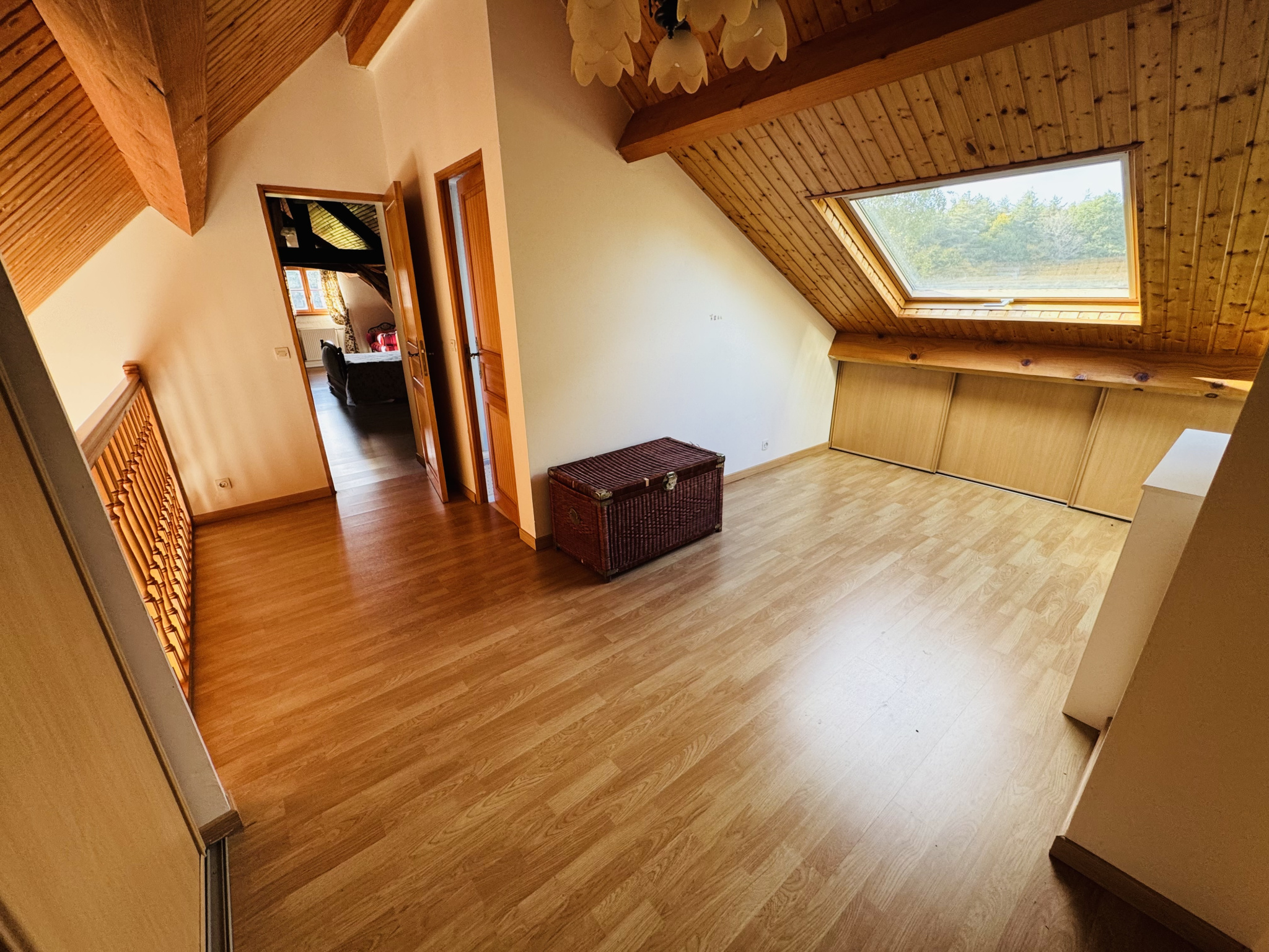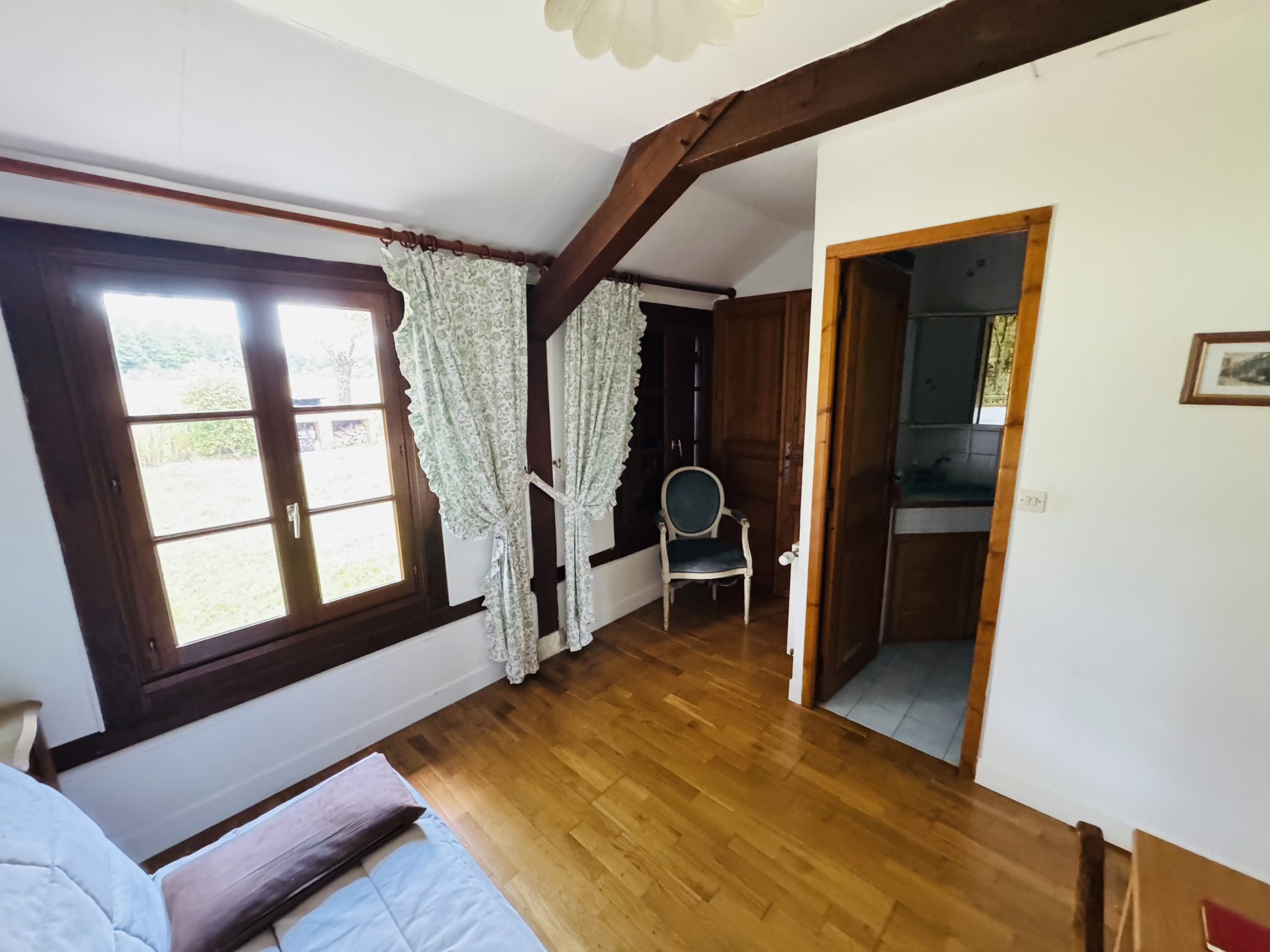 À l’étage : une très grande chambre avec placards et point d’eau, un palier spacieux avec placard, une salle d’eau avec WC et une chambre lumineuse dotée de placards à portes coulissantes.