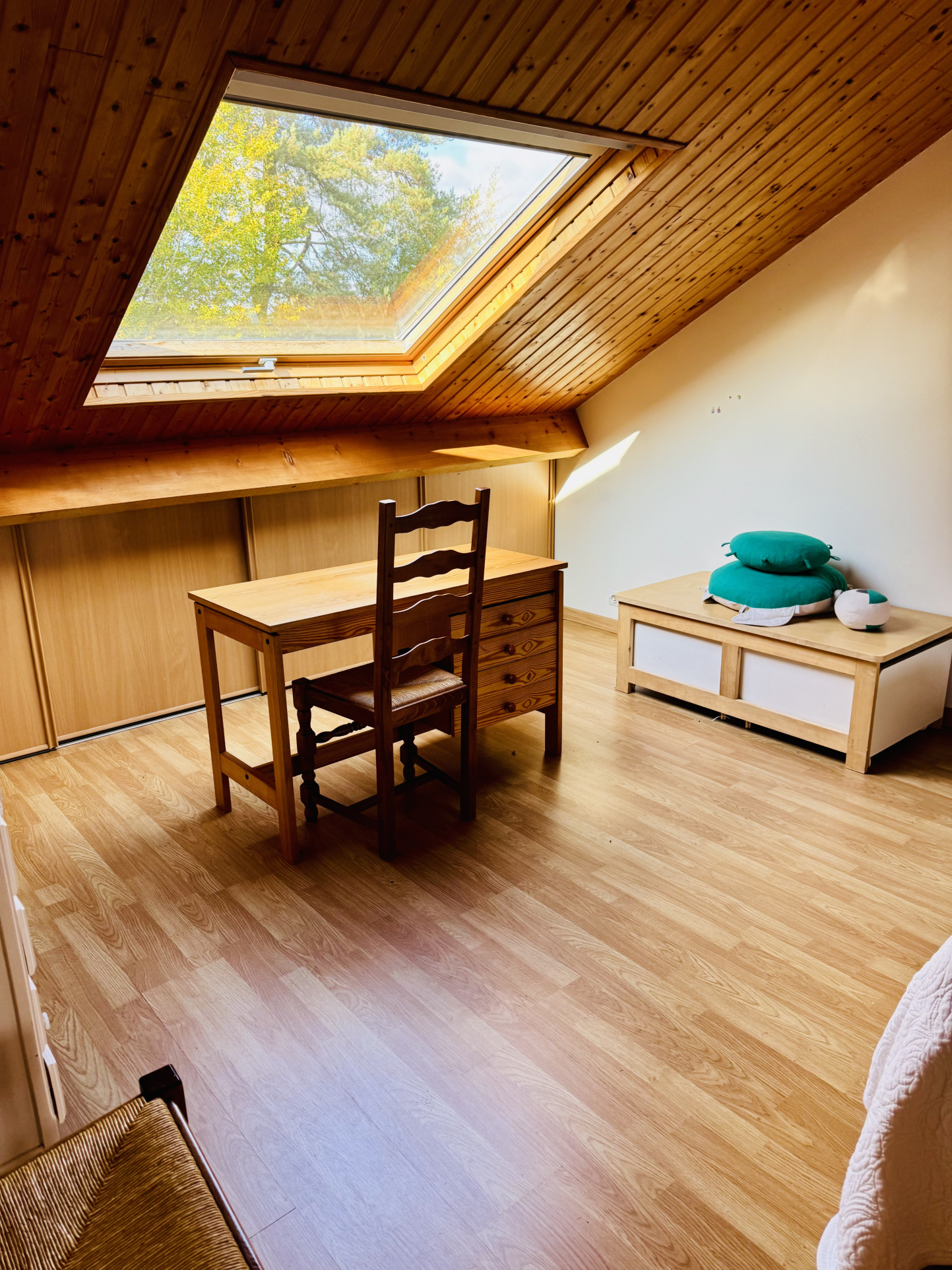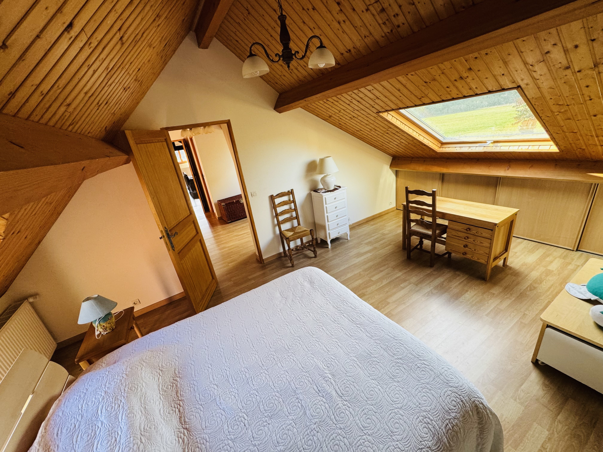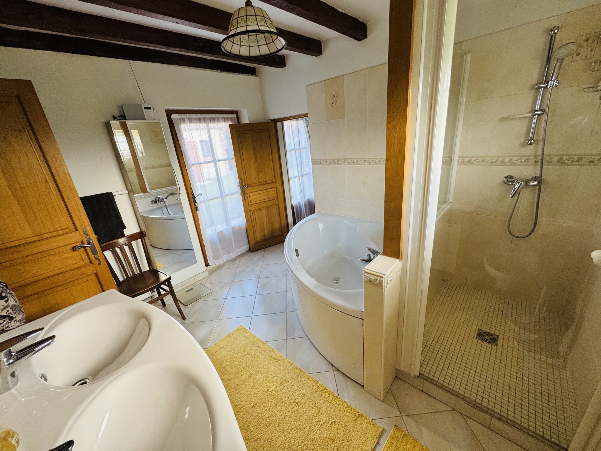 À l’étage : une très grande chambre avec placards et point d’eau, un palier spacieux avec placard, une salle d’eau avec WC et une chambre lumineuse dotée de placards à portes coulissantes.
