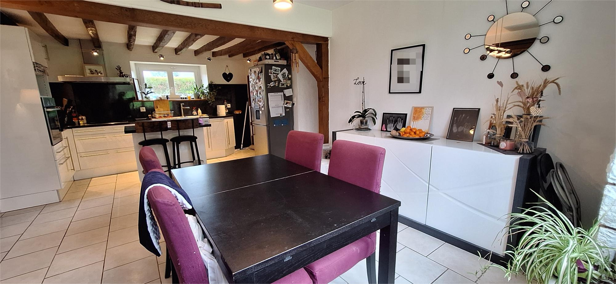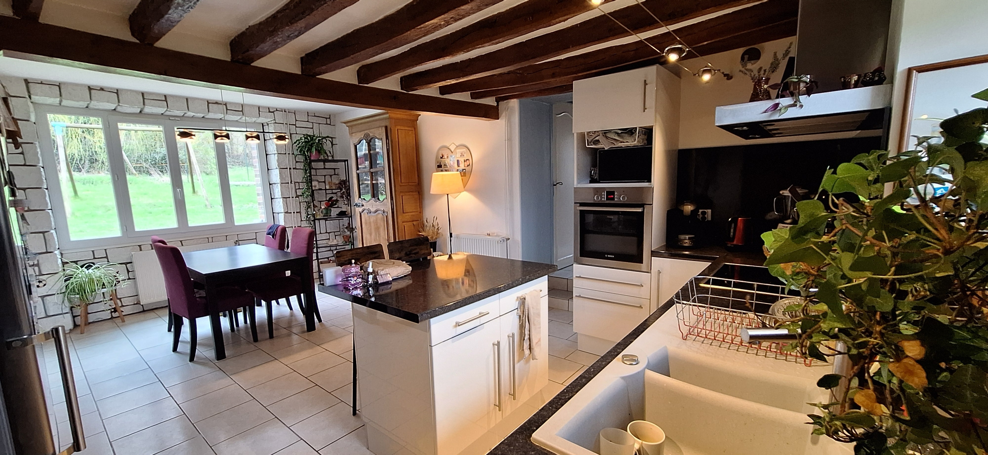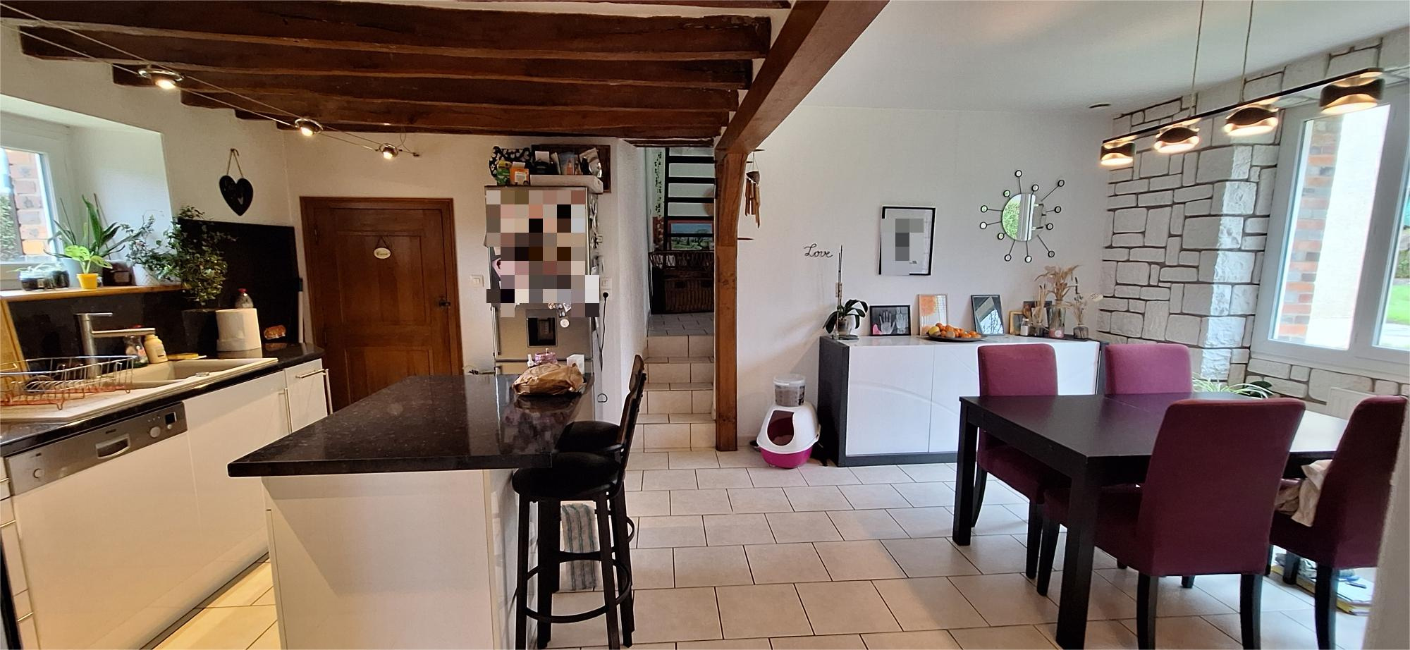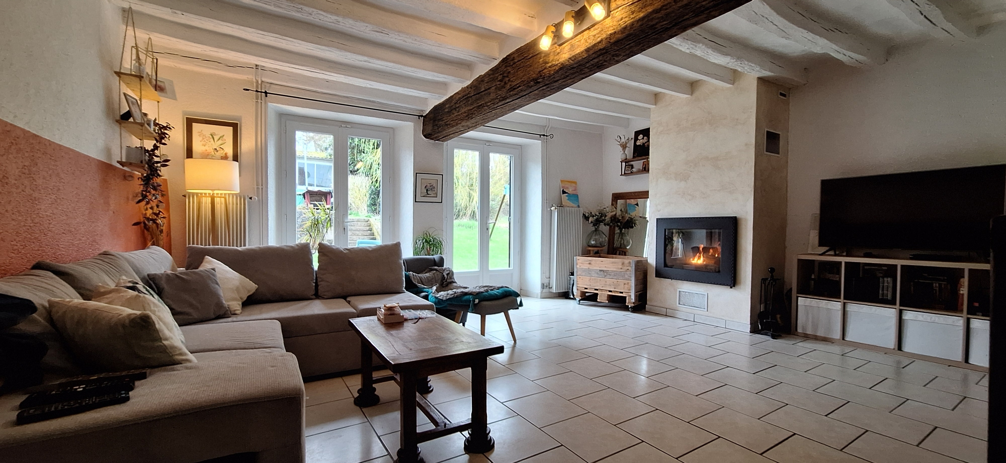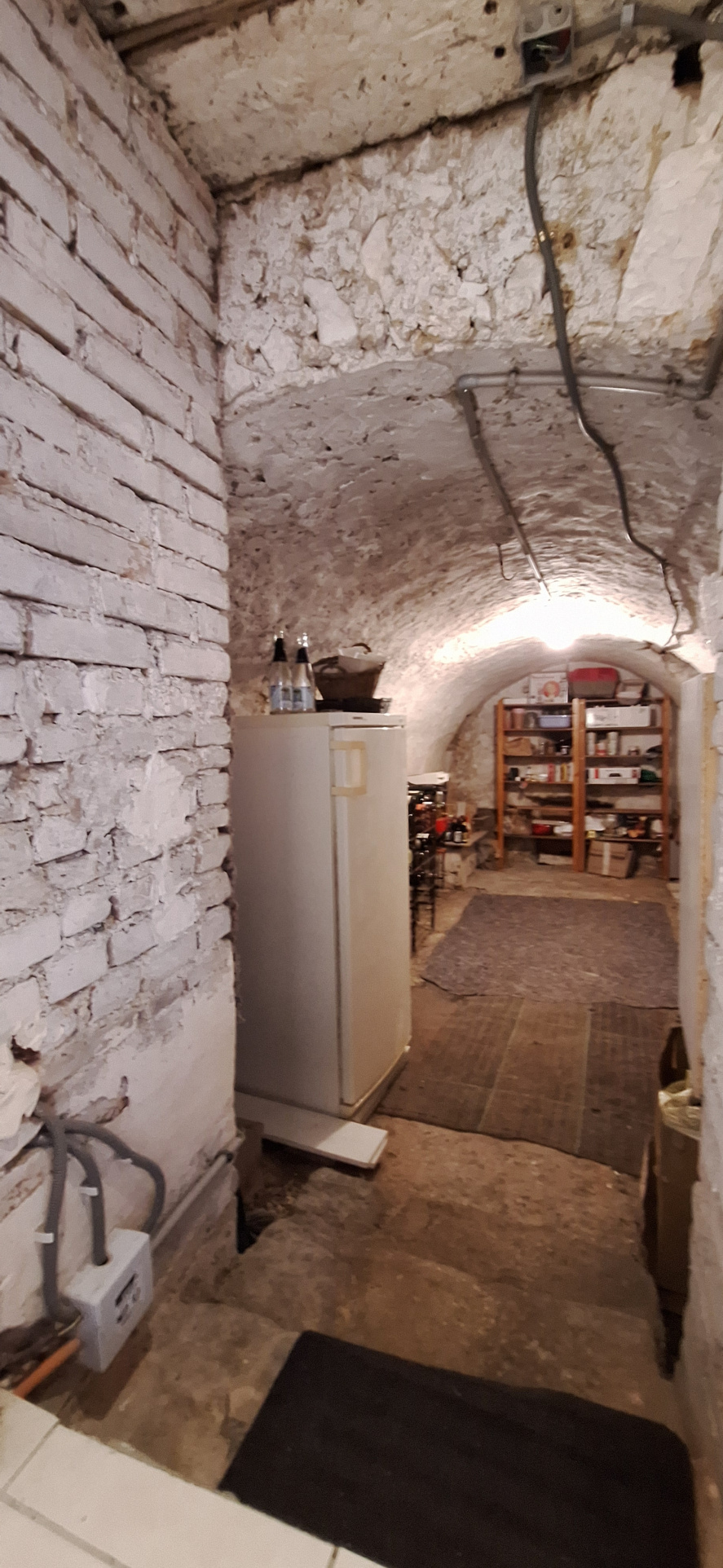 Elle vous invite sur un espace cuisine équipée de 25m2 environ, très lumineux avec un ilot central, avec un accés sur un espace cave voûtée de plain pied, et vous guide vers un salon de 30m2 avec sa cheminée/insert avec un répartiteur de chaleur.
