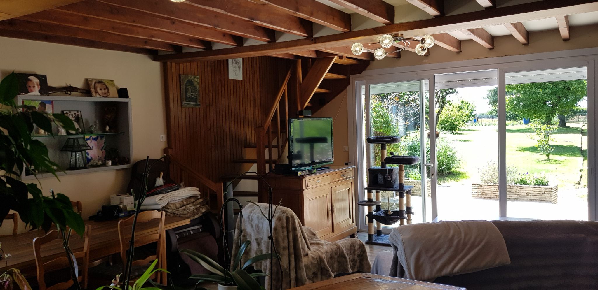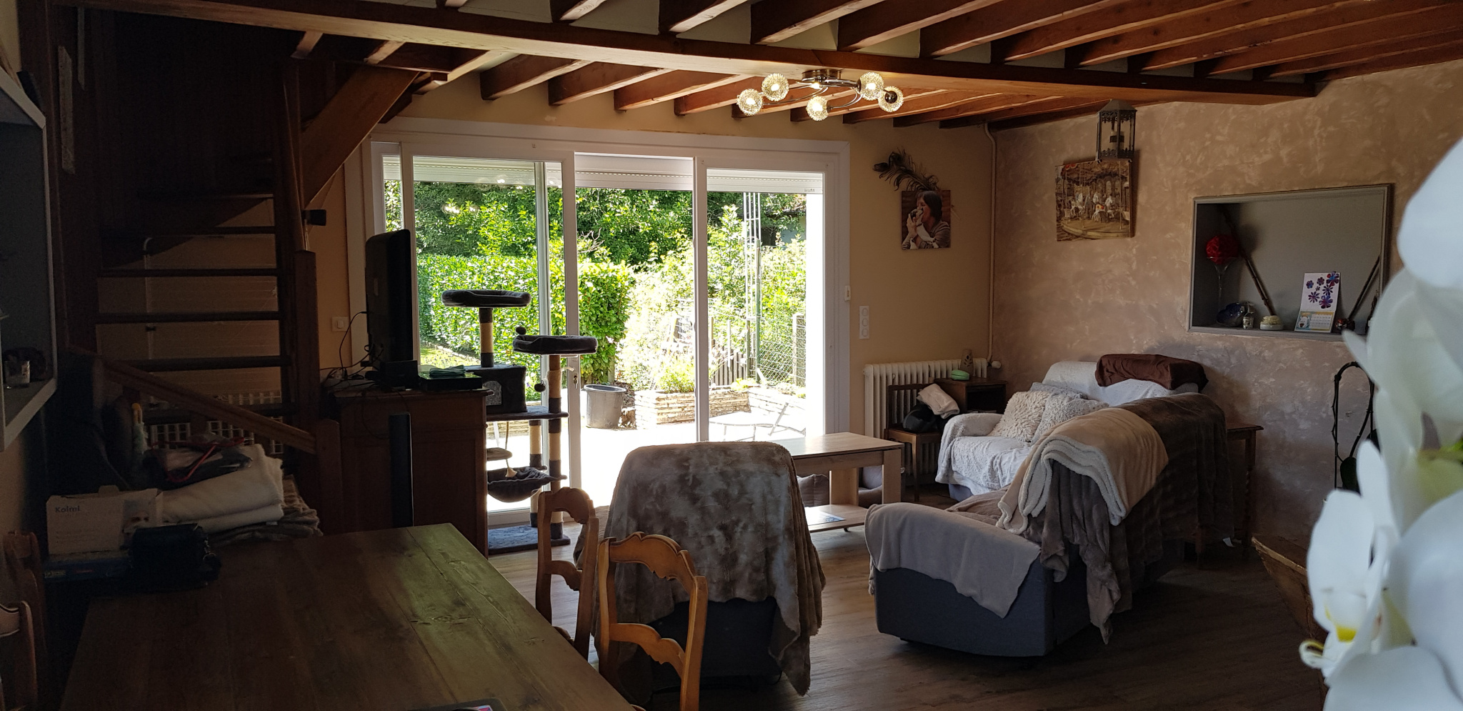 Côté prestations, la maison bénéficie de huisseries double vitrage, d’un chauffage récent par pompe à chaleur air/eau, ainsi que d’un chauffe-eau thermodynamique — assurant à la fois confort et maîtrise énergétique. Taxe foncière d’environ 85 €/mois. Assainissement par fosse septique.