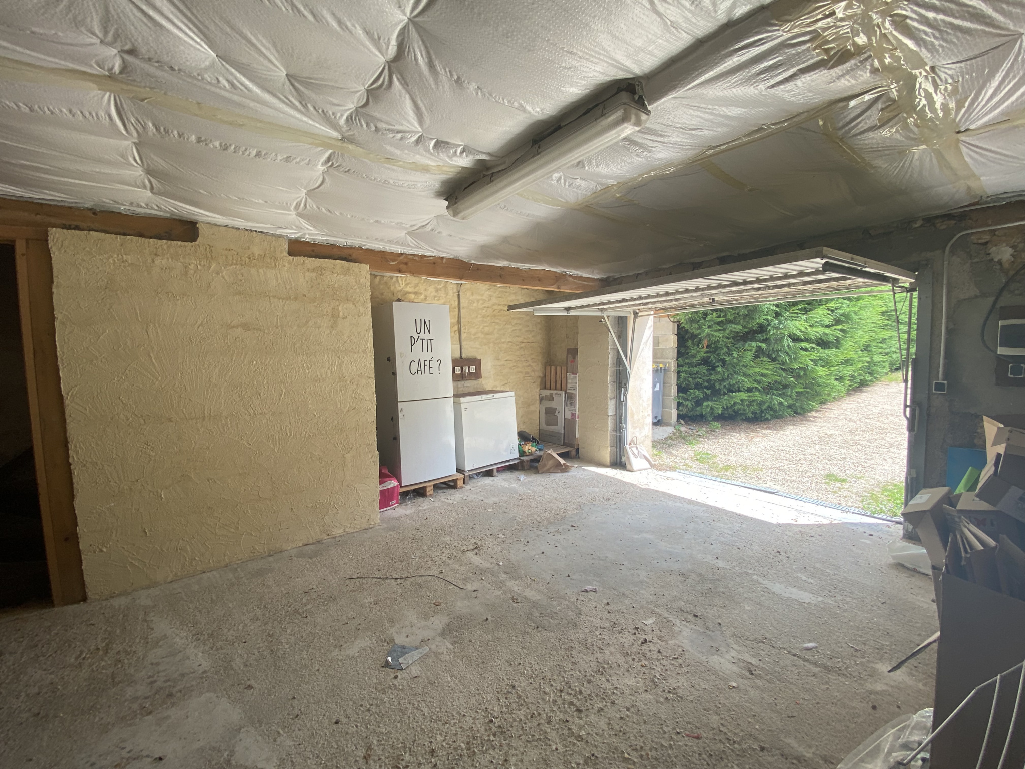 A l'extérieur, la terrasse donne sur une belle cour et une grange rénovée en 2 garages fermés. Une chambre a été aménagée dans les combles au dessus d'un garage. Possibilité d'aménager la seconde partie.